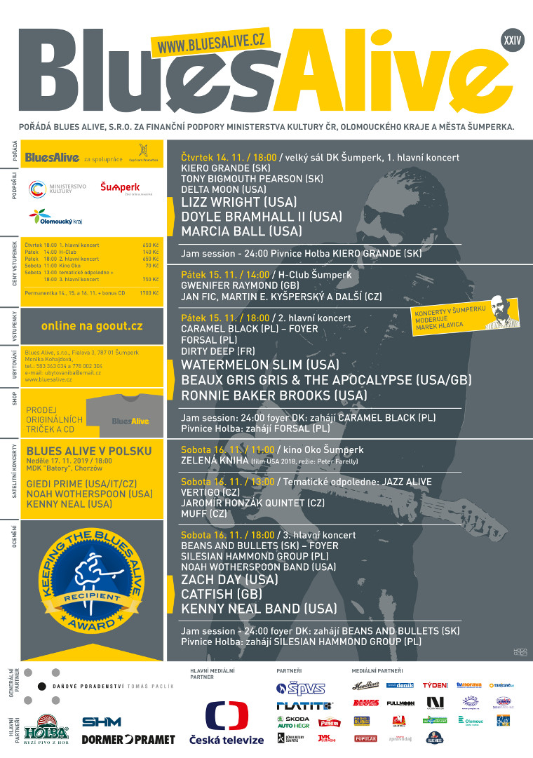 Šumperk, 5. června - Letošní držitel nejprestižnější ceny bluesového světa blues Music Award v kategorii současného blues, louisianský multiinstrumentalista a zpěvák Kenny Neal. Nejlepší současná pianistka podle týchž cen Marcia Ball, jeden z nejvýznamnějších představitelů střední generace chicagského blues Ronnie Baker Brooks či mimořádně úspěšná gospel-bluesová zpěvačka Lizz Wright. To jsou jen některá ze jmen hvězd letošního čtyřiadvacátého ročníku mezinárodního festivalu Blues Alive. Ten se uskuteční ve dnech 14. až 16. listopadu tradičně v Domě kultury v Šumperku.