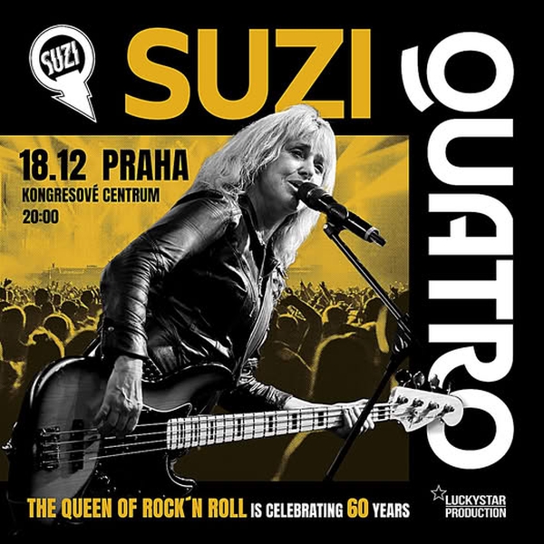 Energická královna rock and rollu Suzi Quatro slaví 60 let na scéně a připravuje další návrat do ČR! Nadcházející koncert se uskuteční 18.12.2025 v pražském Kongresovém Centru.